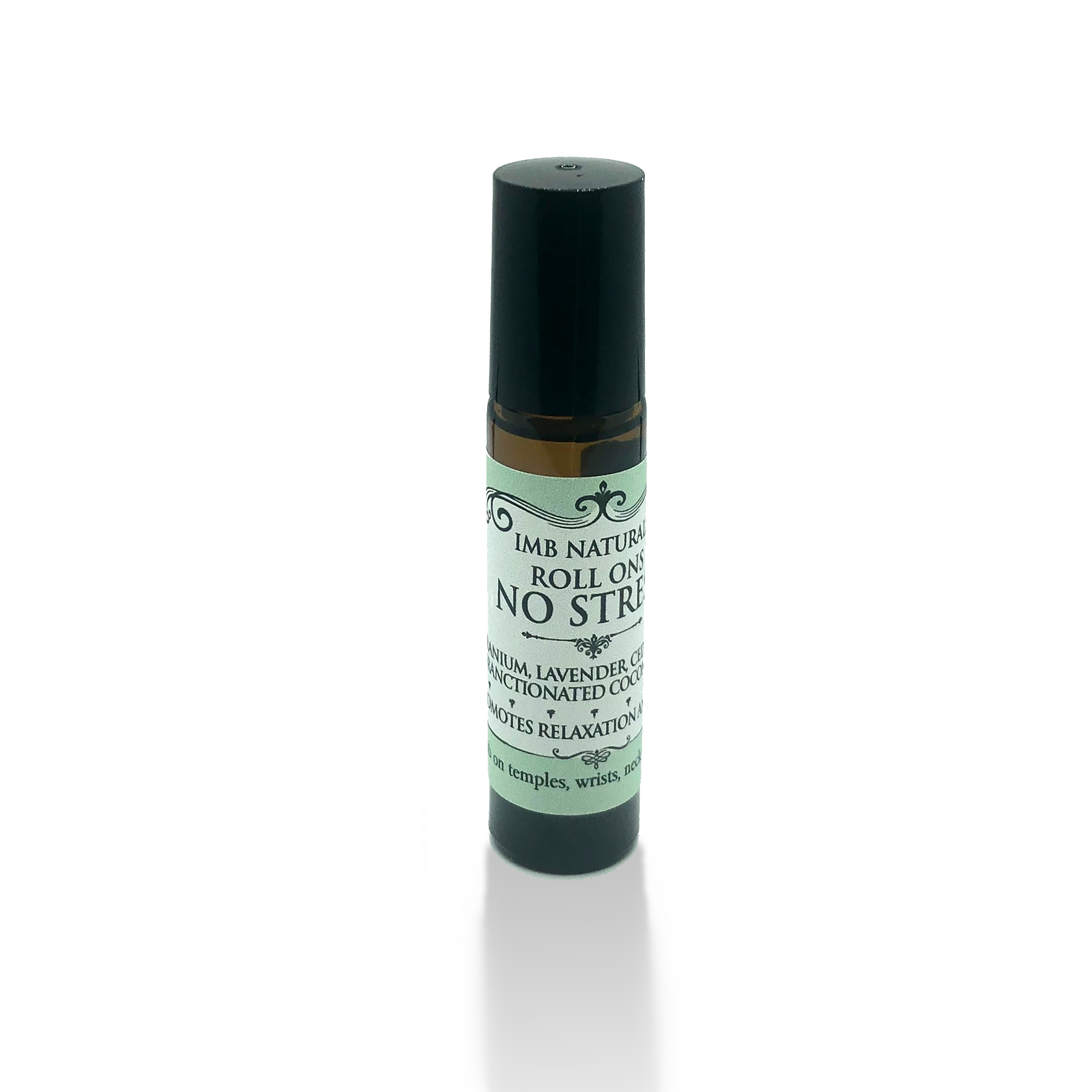 No Stress-Pure Essential Oils of Geranium, Lavender, Cedarwood, and Franctionated Coconut Oil.